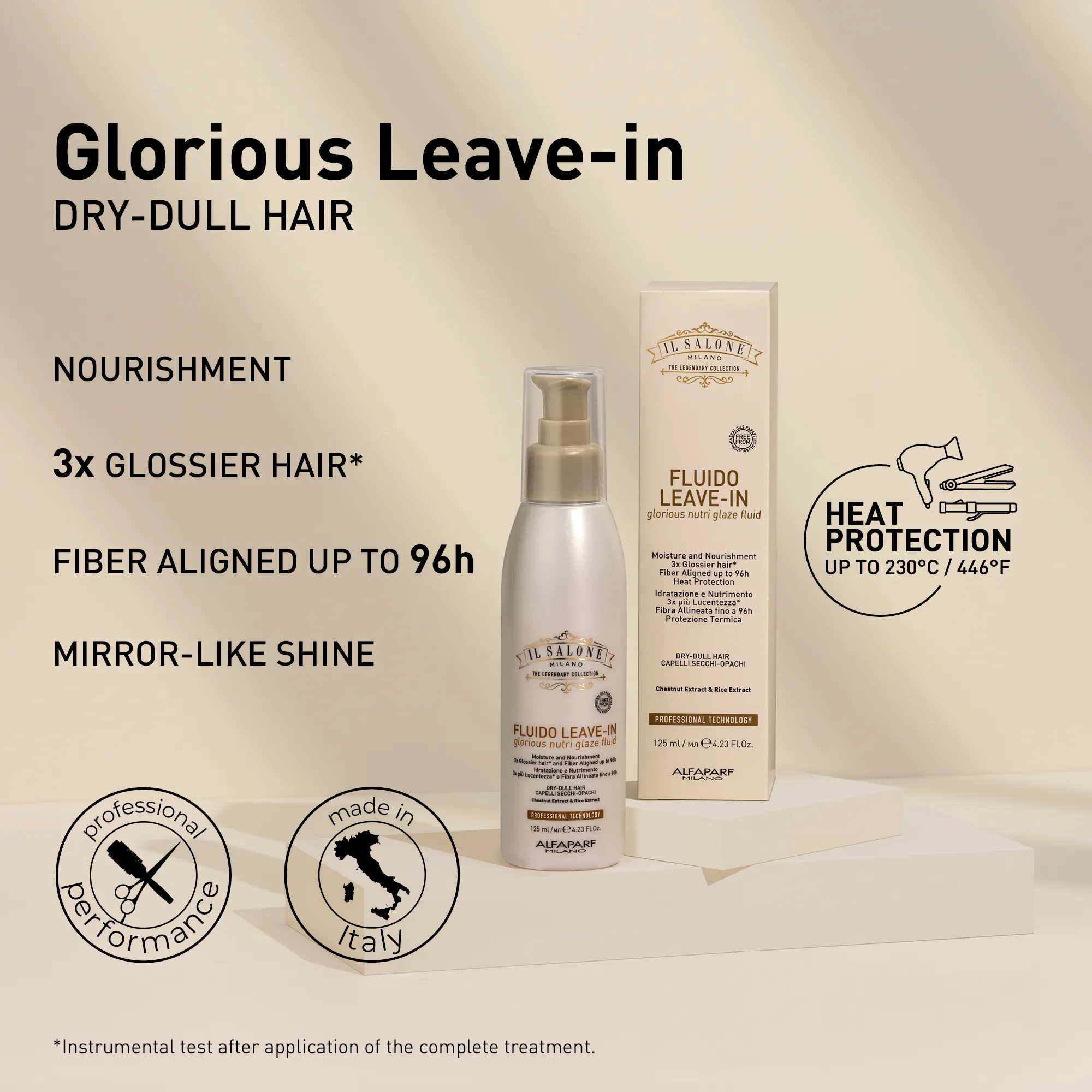 თმა გლუვი, მოწესრიგებული და კაშკაშაა. 230° (446°F)-მდე სითბური დაცვა.